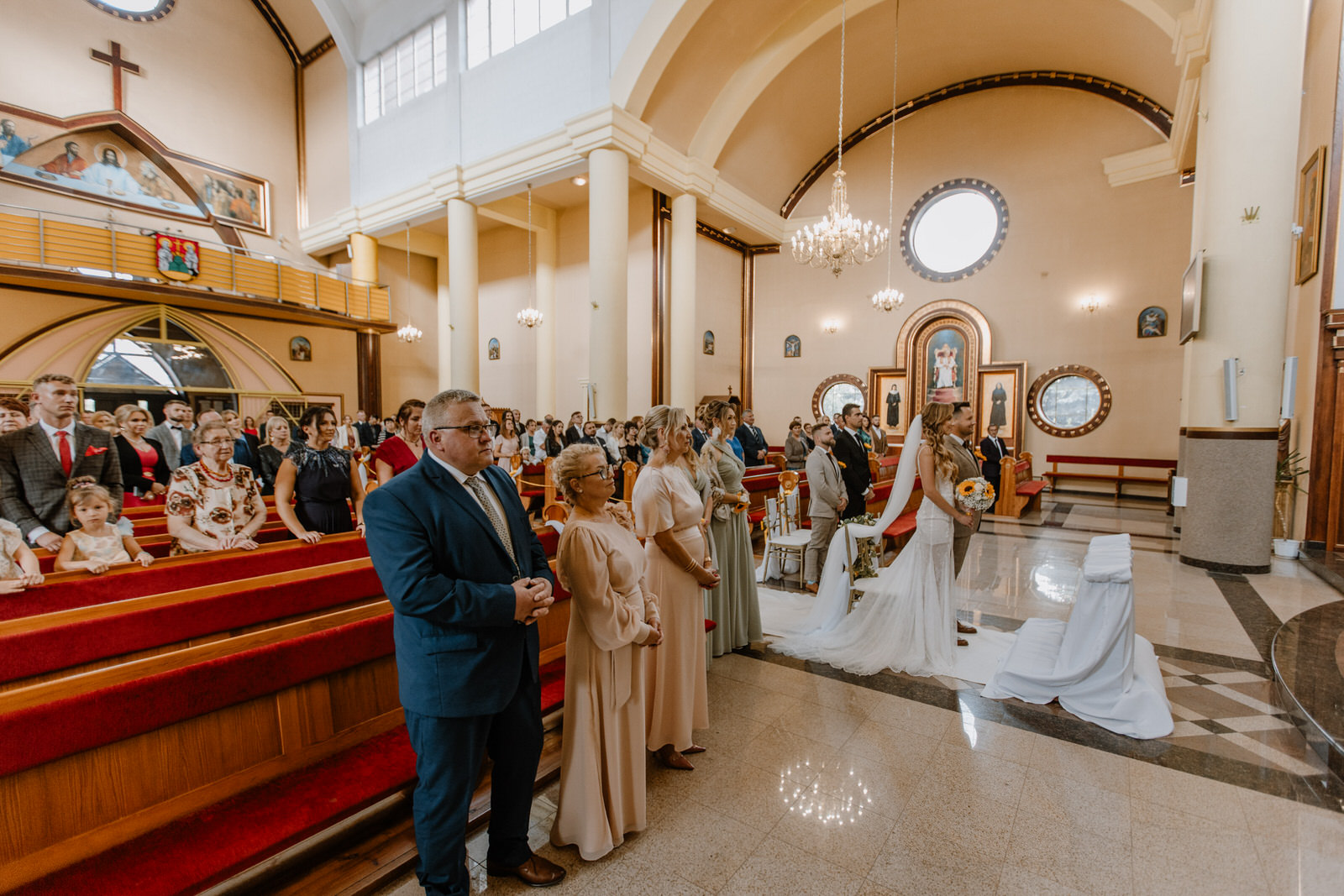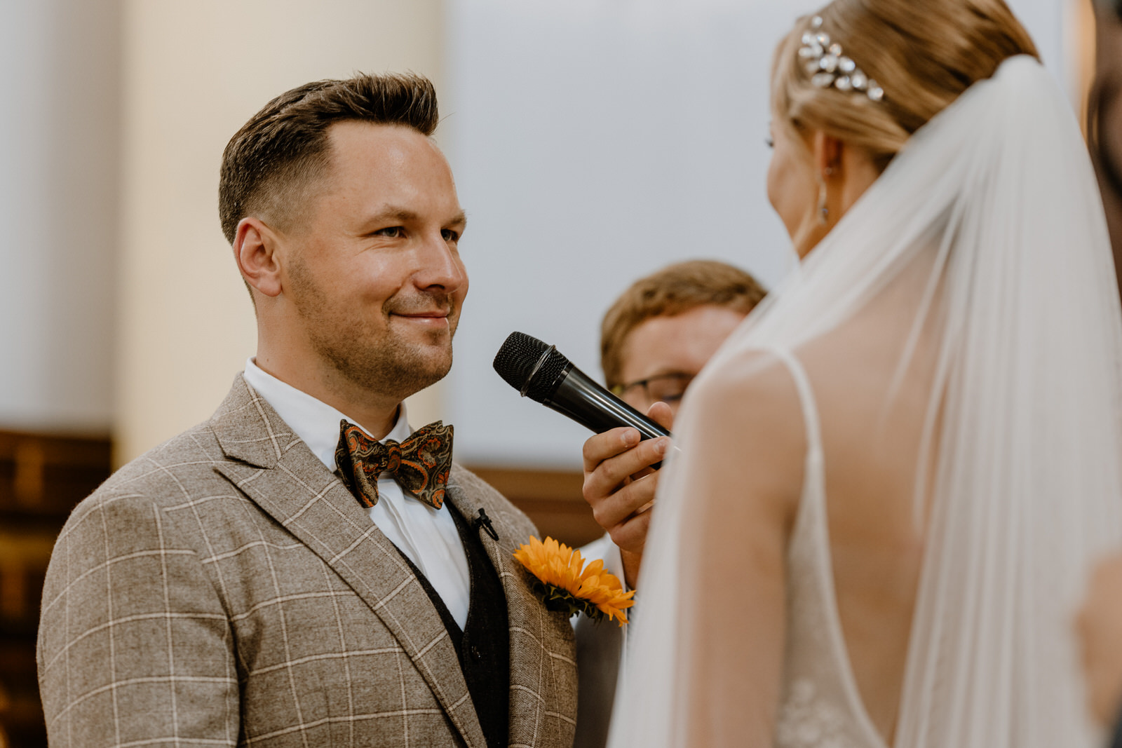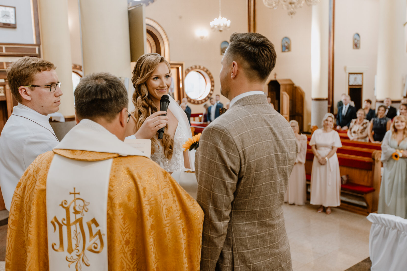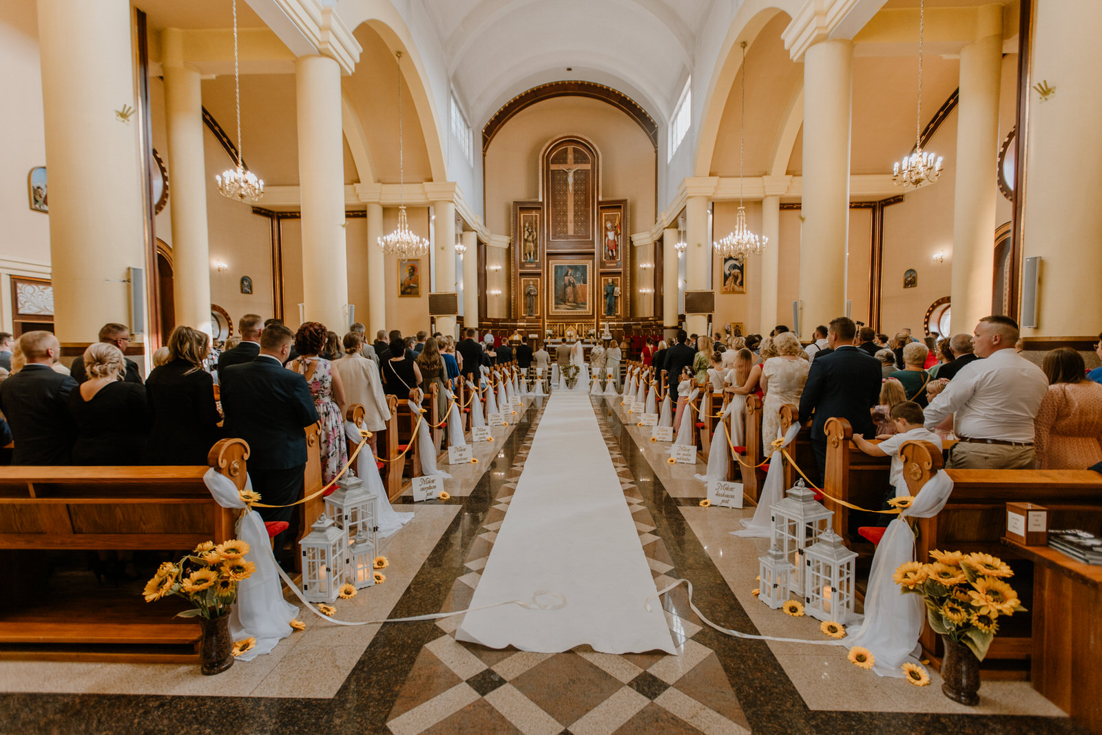 Kamerzysta na wesele i fotograf ślubny muszą być czujni. W 3FILM największe skupienie jest na tej chwili. Przysięga małżeńska to powód dla którego jest to całe zamieszanie. Czujemy ciężar odpowiedzialności za materiał i robimy wszystko aby wyszło pięknie. Ceremonia zaślubin wymaga od Nas: odpowiedniego ubioru, godnego zachowania w świątyni oraz skupienia podczas pracy. Tego już nie da się powtórzyć więc staramy się zarejestrować każdą ważną sekundę. Sylwia i Maciek bardzo przyłożyli się do przygotowań. Wybrali też piękne dekoracje świątyni. Może już zauważyliście po wcześniejszych zdjęciach. A może nie? Motywem przewodnim tego dnia był słonecznik. Towarzyszył Parze Młodej na przygotowaniach, jest widoczny w kościele. Pewnie będzie go też dużo w Silaine.